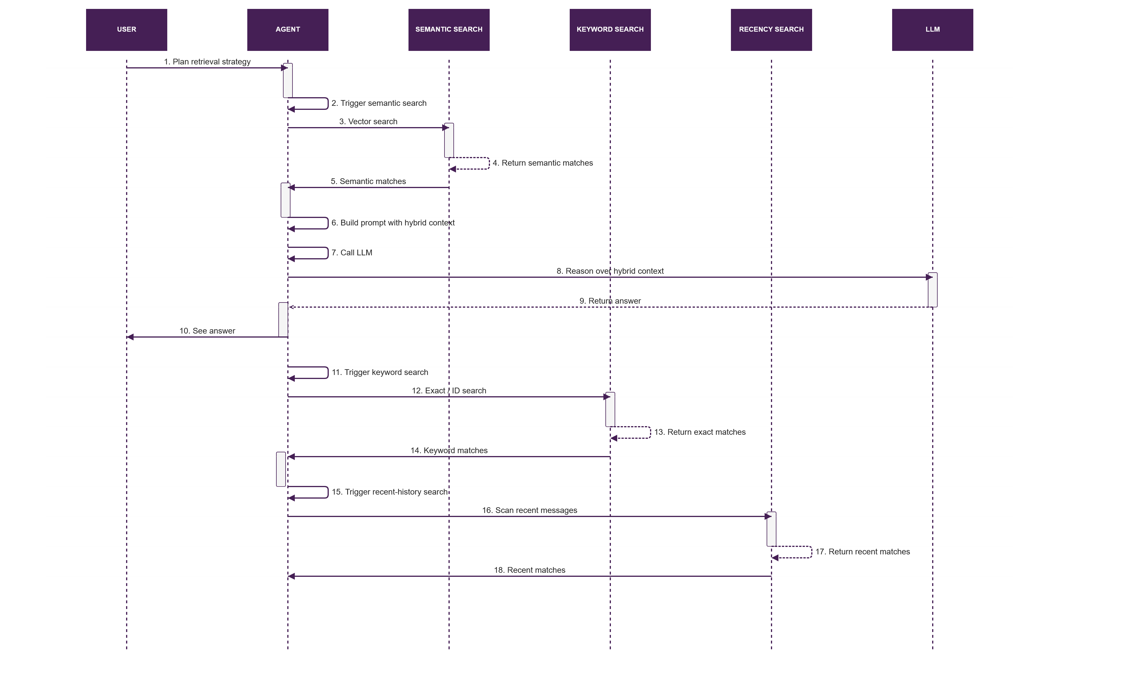 - 混合检索 —— 语义检索、原始文件与近期历史的组合。